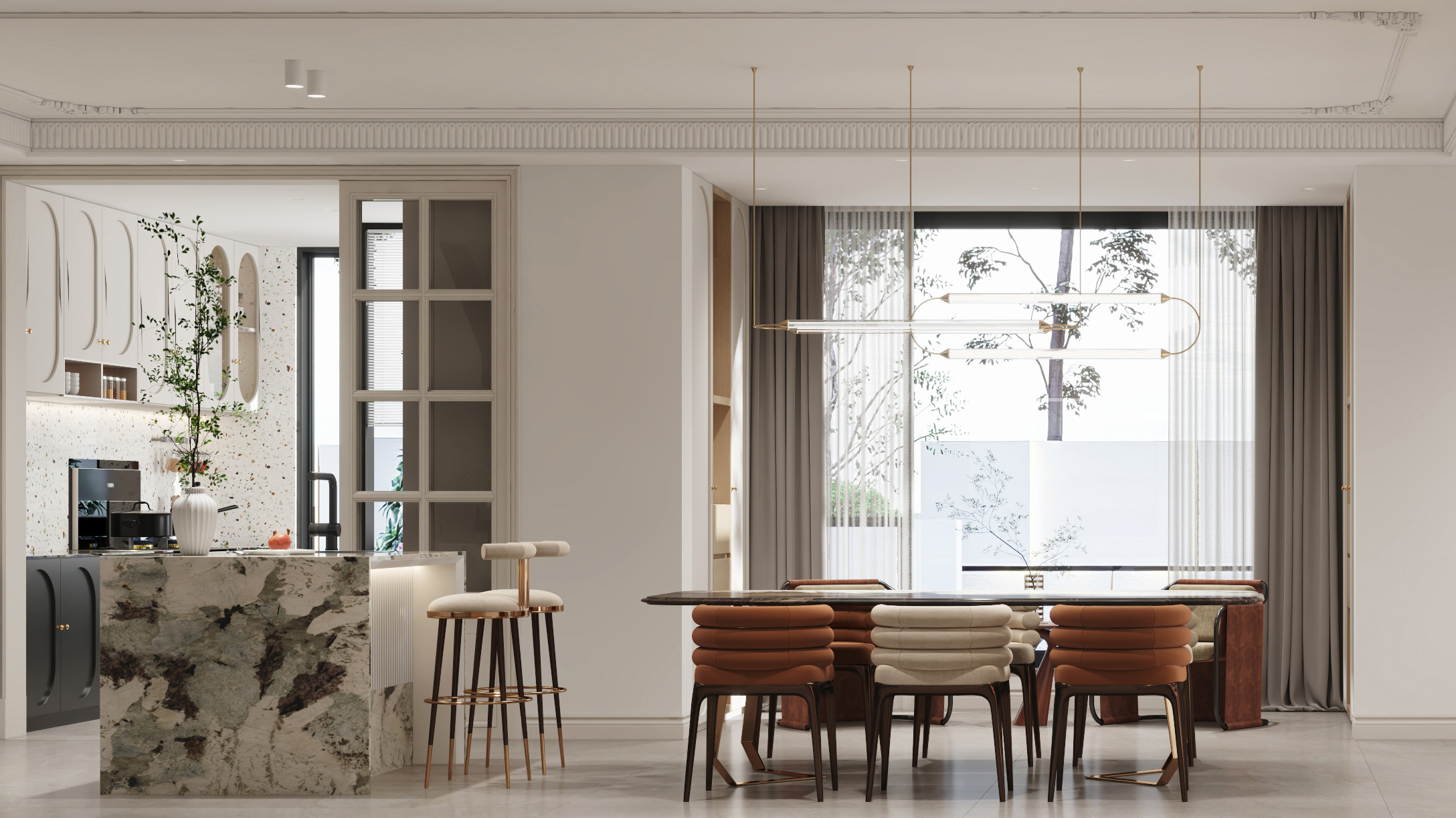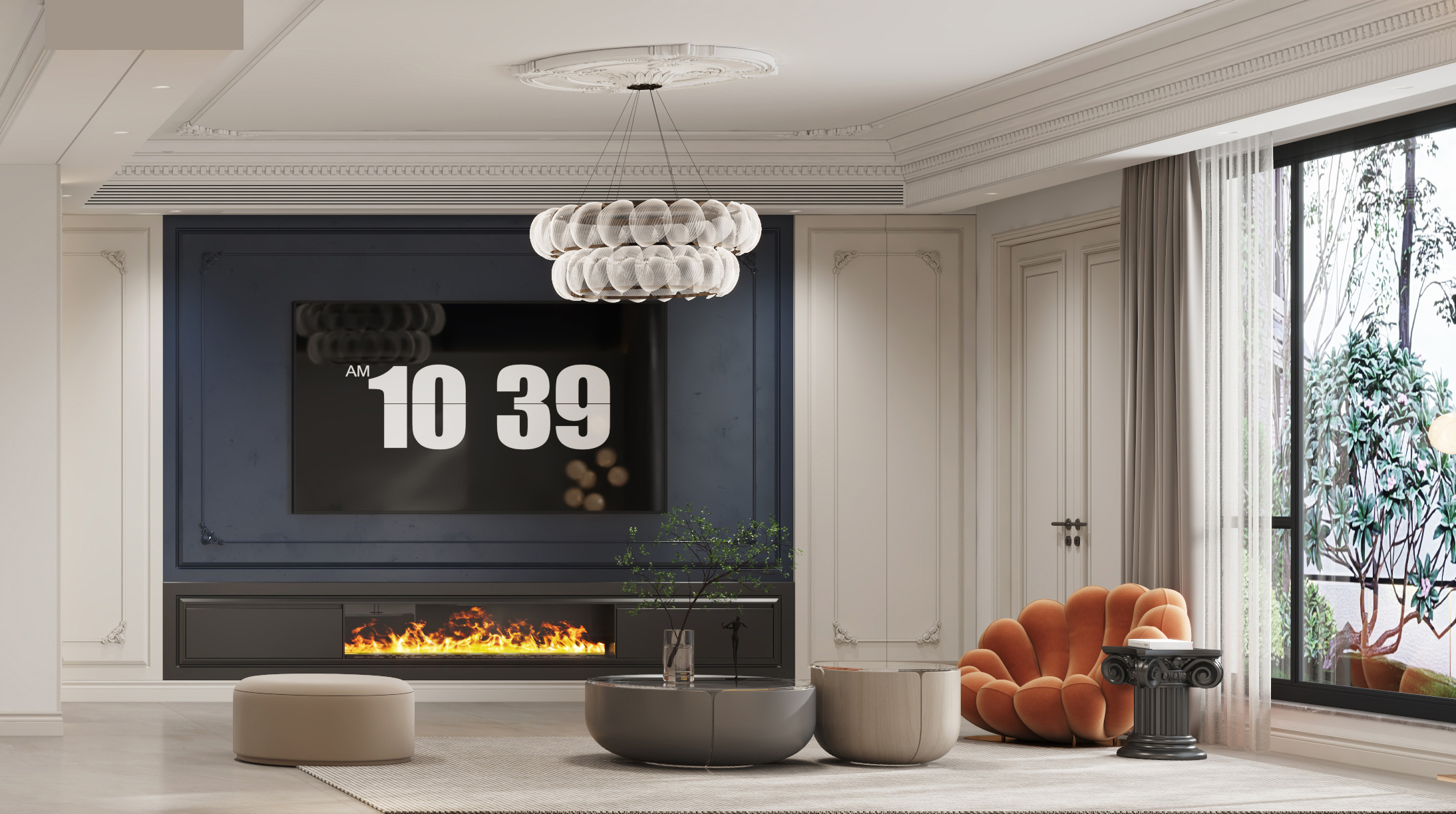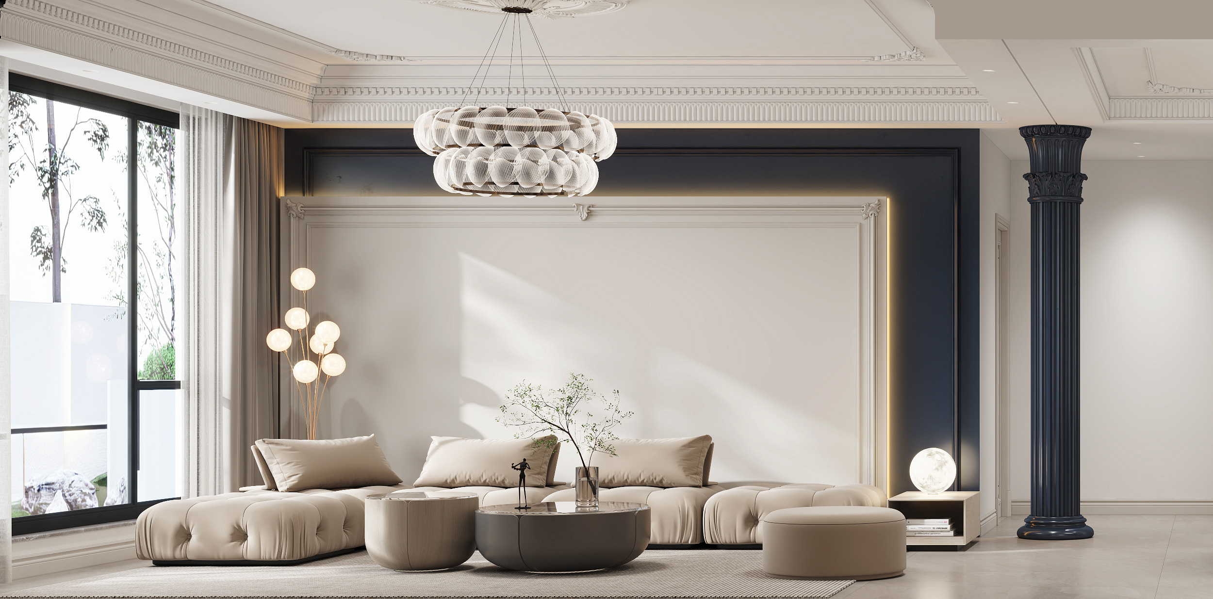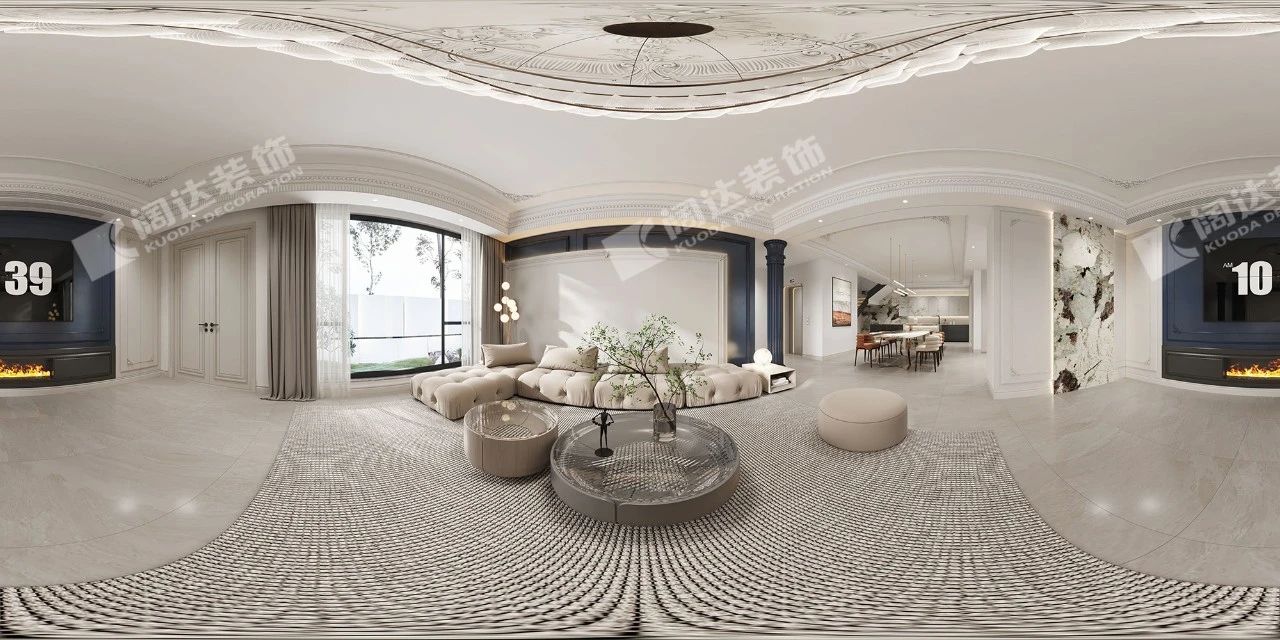頂面?zhèn)裙?,使?yōu)美的石膏線條更具層次感,保證了視覺上的明凈簡約,空間采光也更通透明亮。