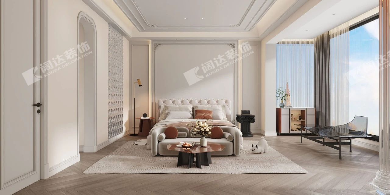 主臥空間渲染著一種靜謐、舒緩的氛圍,讓人身心格外放松舒適,亞力克羅馬柱的運用,也是整個空間的一個點睛之筆。