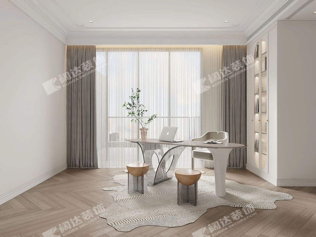 本案在視覺空間上顯得簡潔明亮,奶白色與撞色搭配,豐富了空間,給家居生活帶來無限的可能性。