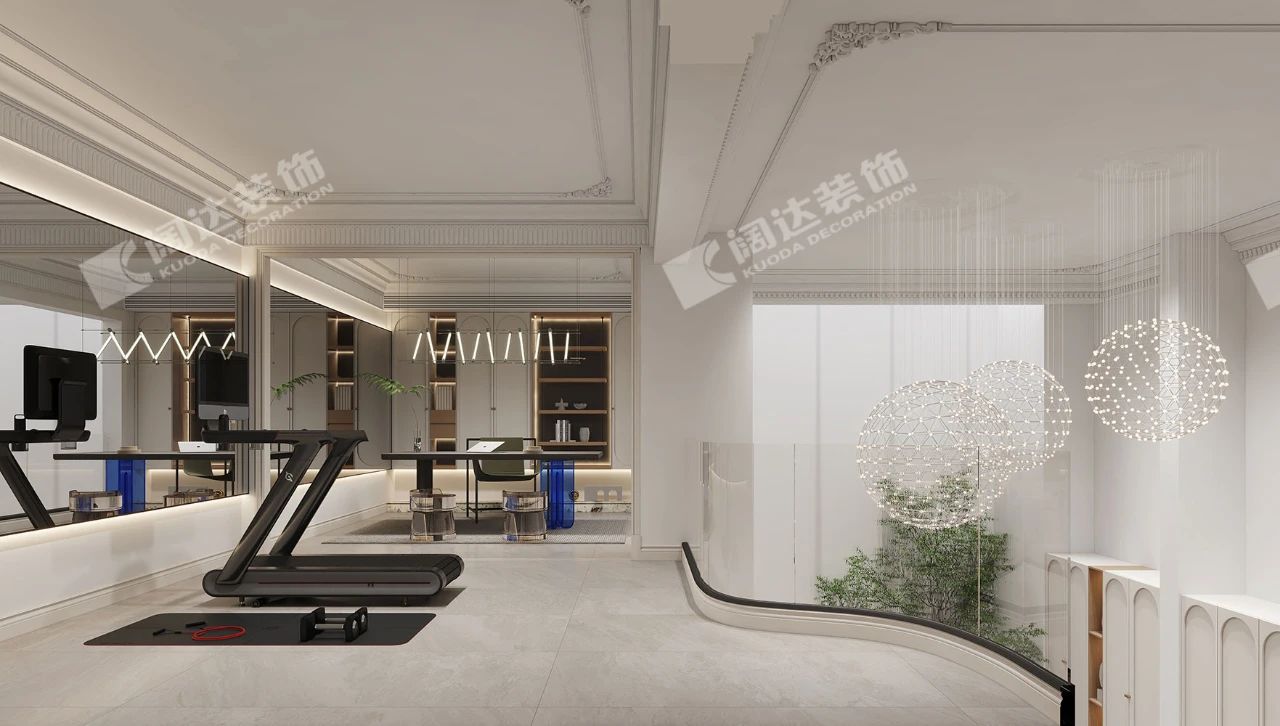 隔層區(qū)域是健身區(qū)和主人書房區(qū)域,為了在視覺上放大空間,將健身區(qū)的鏡子延伸穿插到書房里面,用氛圍燈進(jìn)行鏈接,看似單獨的兩個空間,卻又有著緊密的聯(lián)系。