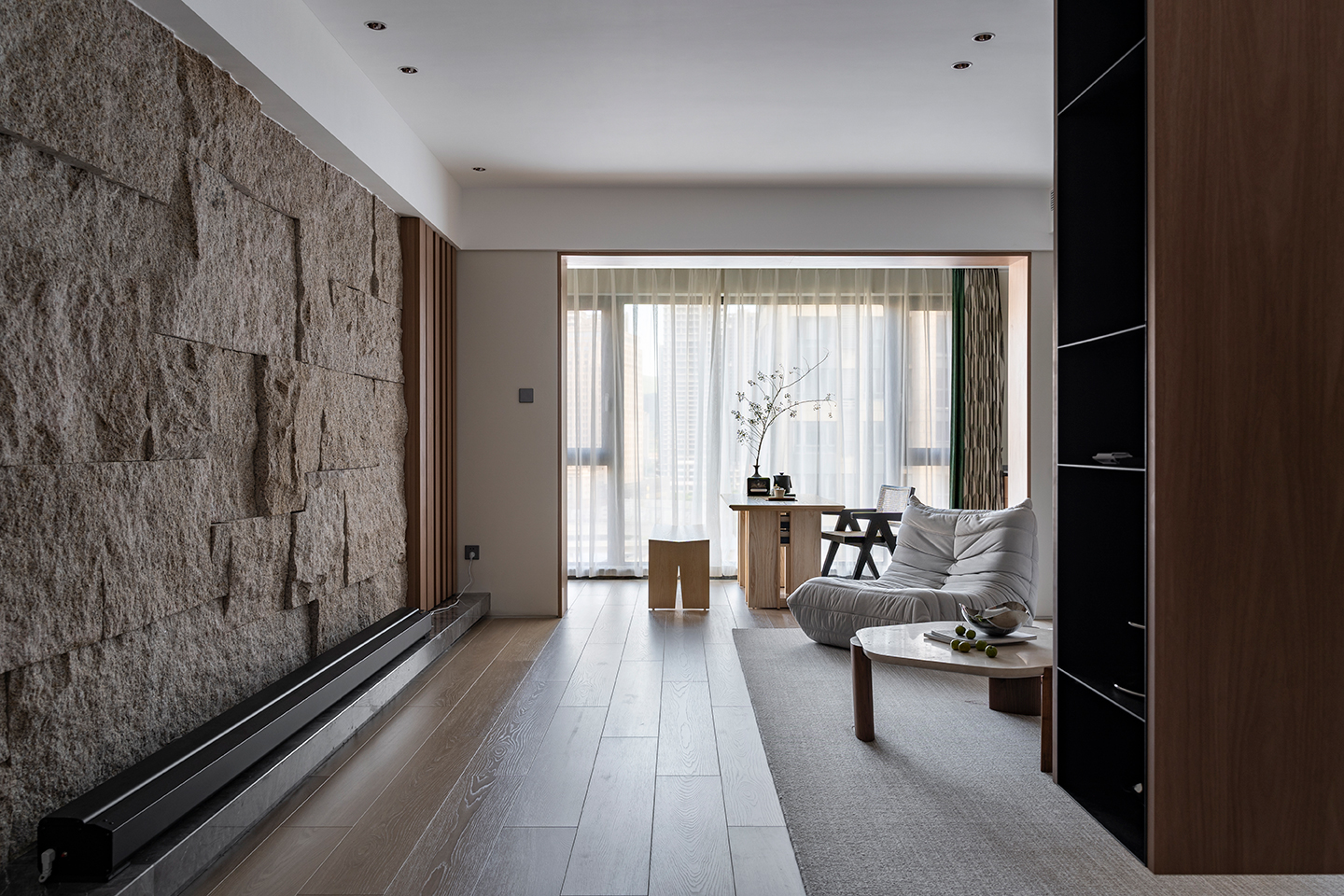 客廳背景處利用了天然毛石的質(zhì)感,體現(xiàn)自然的主題。