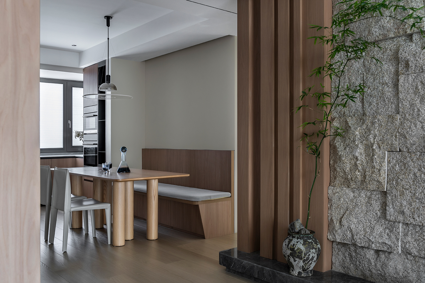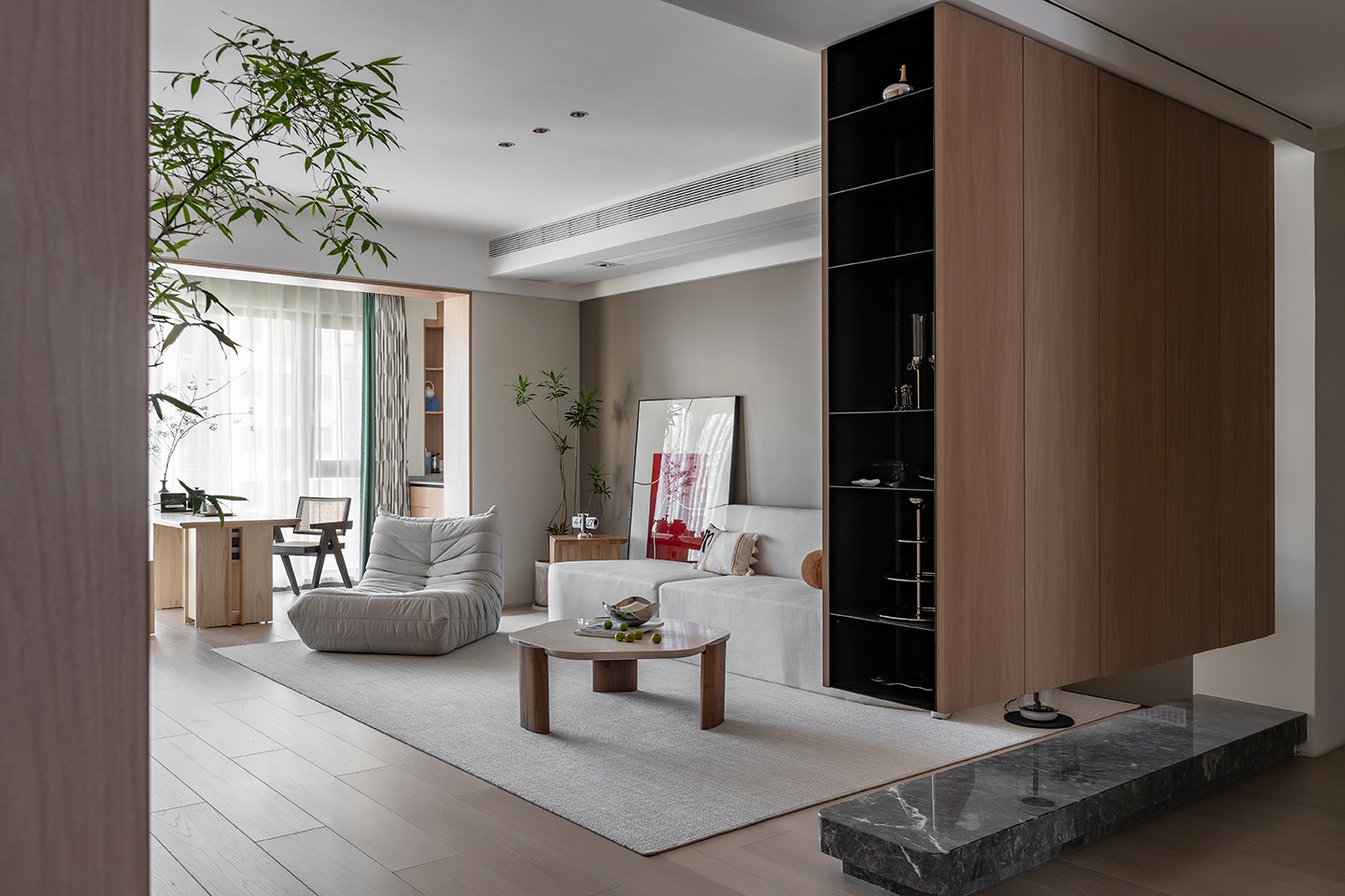 整體硬裝木飾面材質(zhì)統(tǒng)一,在軟裝上配合時(shí)尚的家具單品,體現(xiàn)悠然自得的生活境界,從而達(dá)到業(yè)主最初向往的世外桃源。