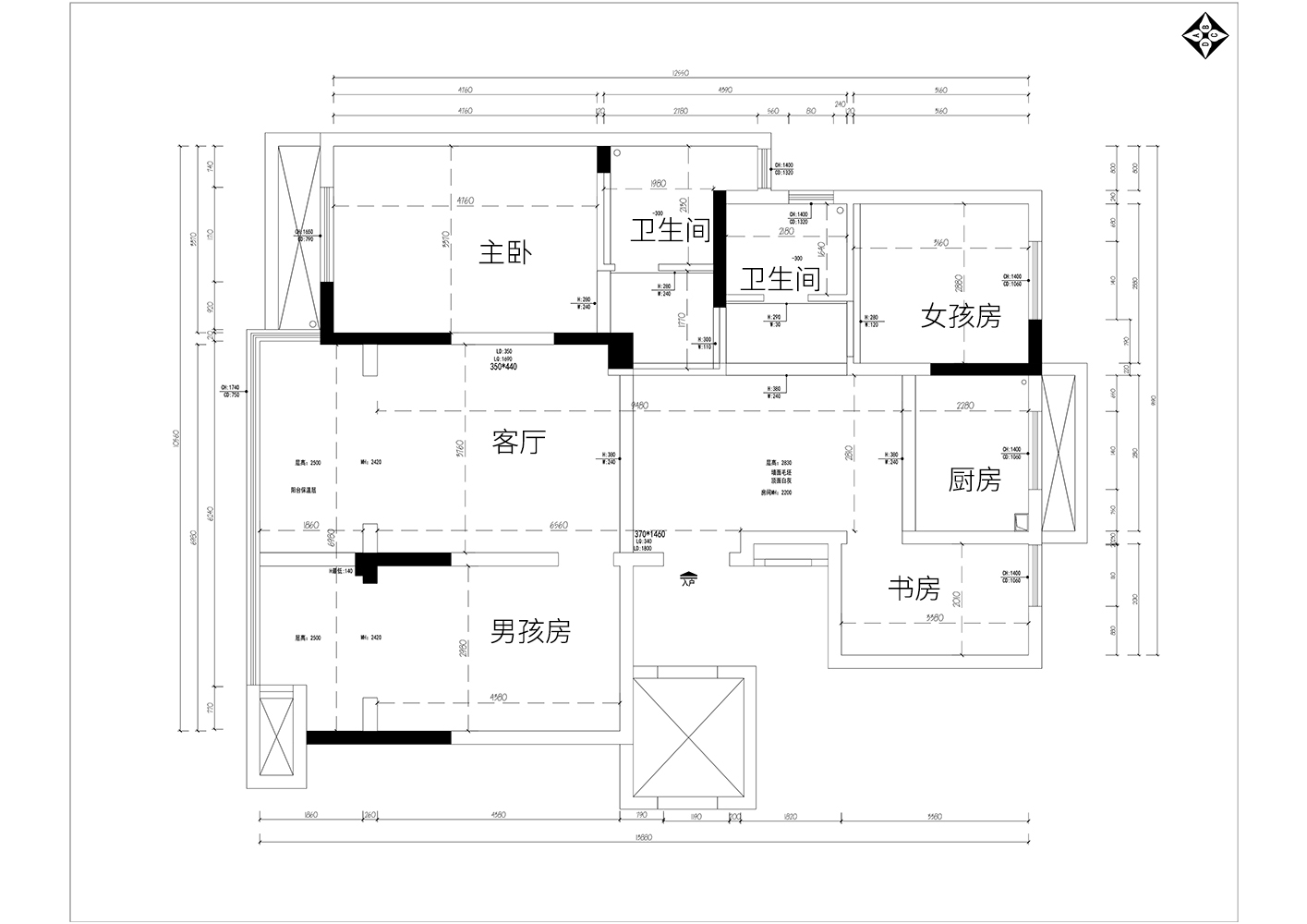 1、將兩個衛(wèi)生間重新分配,改成三個獨立的功能區(qū),滿足了一家四口淋浴、坐便、洗漱的正常使用