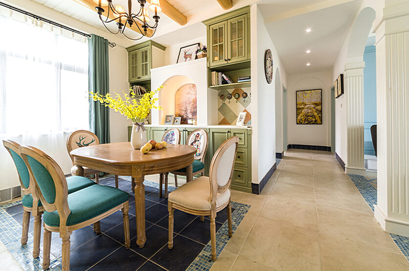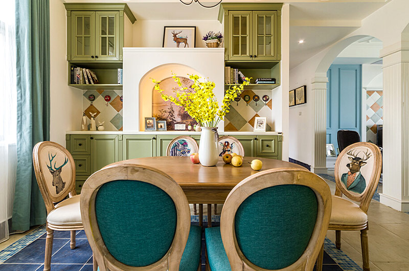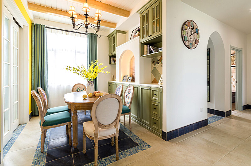 本案中的130平米的三居室整體采用了地中海風(fēng)格裝修,并在清爽愜意的空間氛圍中融入了田園風(fēng)格的清新自然感,在色彩的選擇上也盡量的以清爽的藍(lán)色和富有活力的明黃色為主,并在餐廳中運(yùn)用了象征著森林的墨綠色,為空間帶來靜謐之感的同時(shí)也增添了幾分自然的氣息。同風(fēng)格案例:更多>>